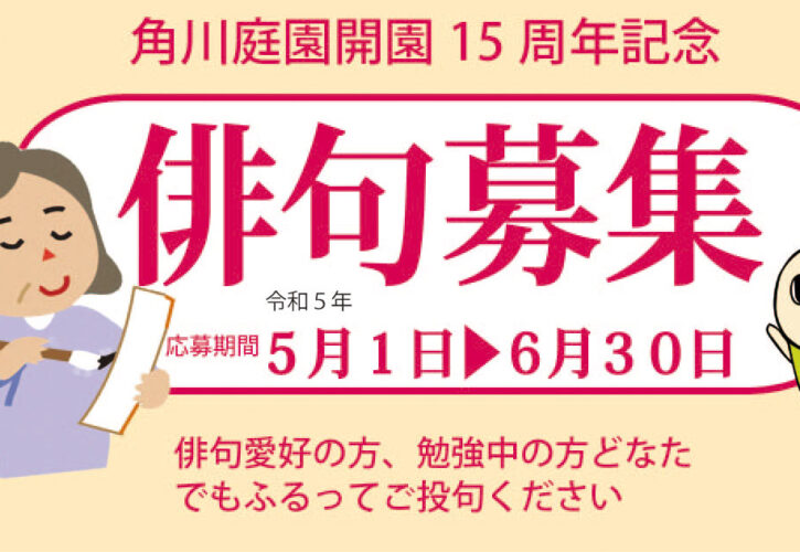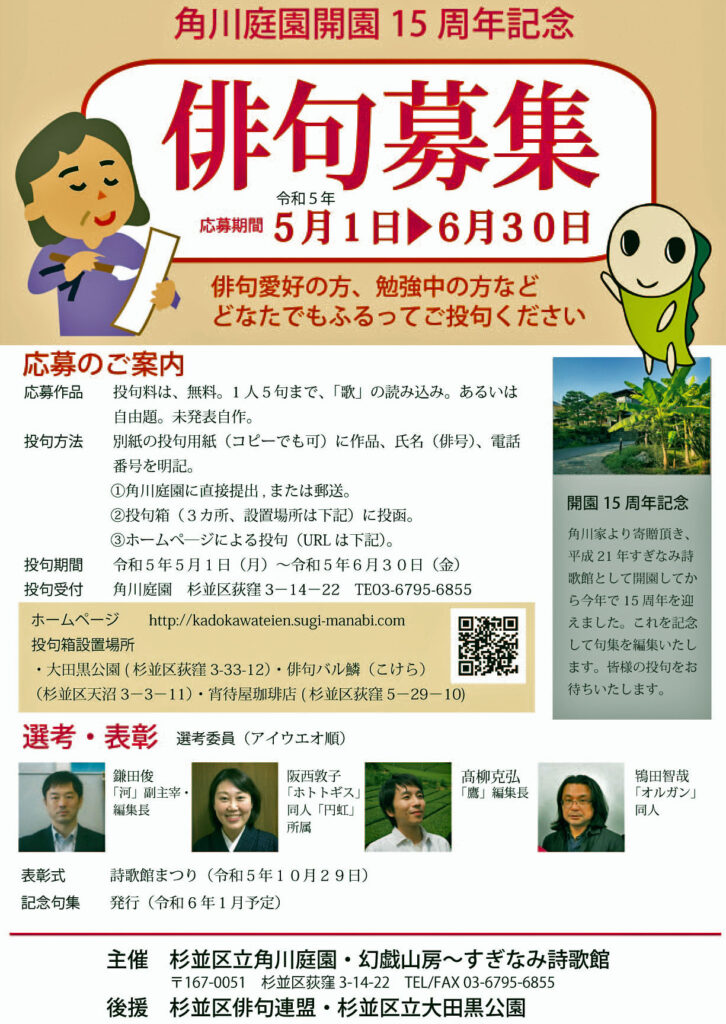 角川庭園開園15周年記念、角川家より寄贈いただき、平成21年「すぎなみ詩歌館」として開園してから15周年を迎えました。 これを記念した句集発刊を企画しました。皆様からの多くの投句をお待ちしております