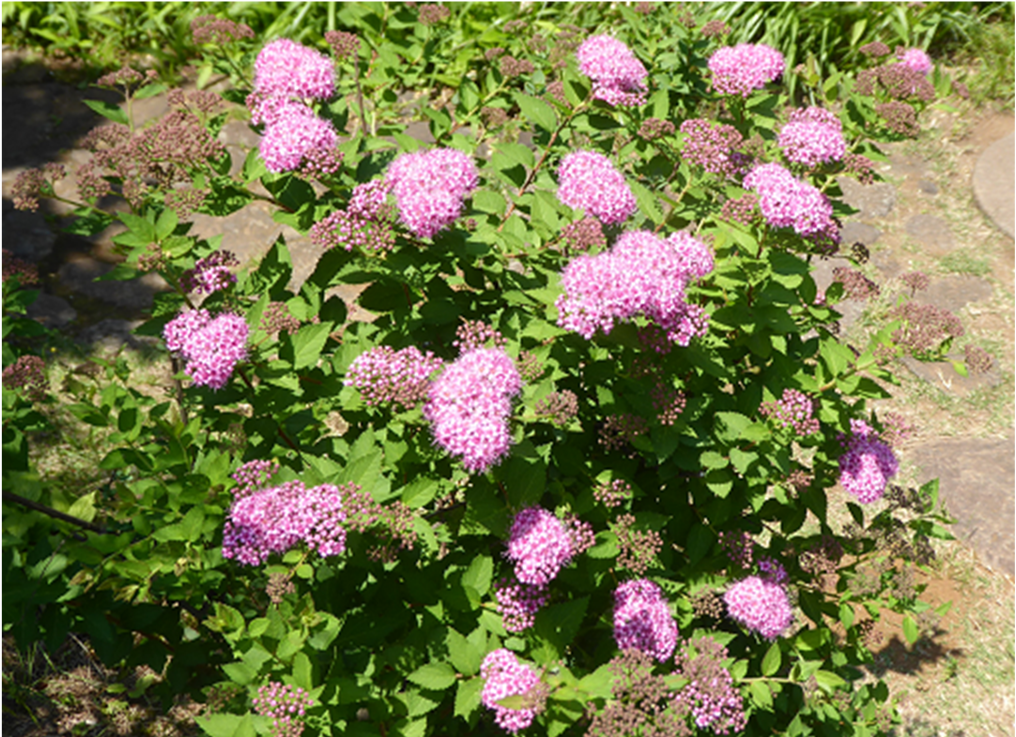 小路の奥の階段を上がった所にシモツケのかわいい花が咲き始めました。