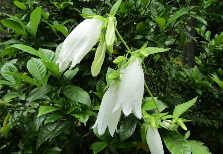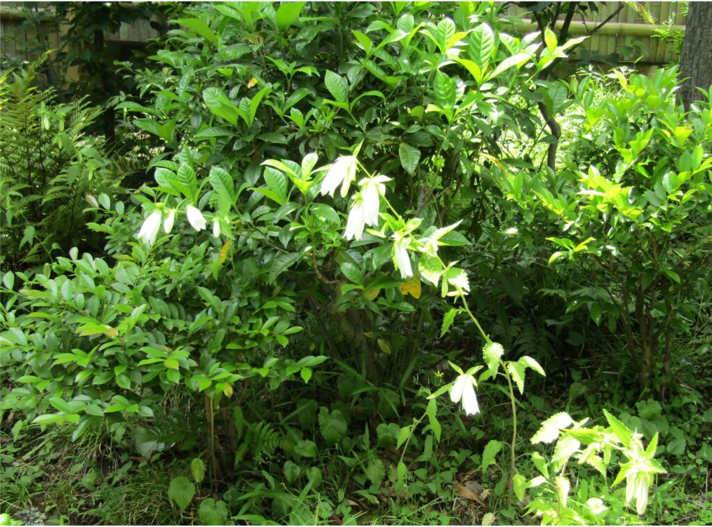 庭園の小路奥の土手に咲き始めました。花は長さ5㎝弱の鐘型で下向きに咲き、花の色は白から紅紫色まで幅があり、おもに初夏に咲きます。子供がホタルをこの花に入れて遊ぶから、あるいはホタルが出る時期に咲くから名がついたとされます。
