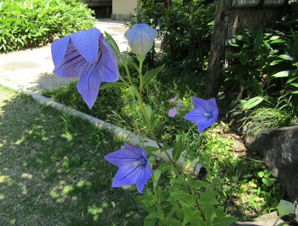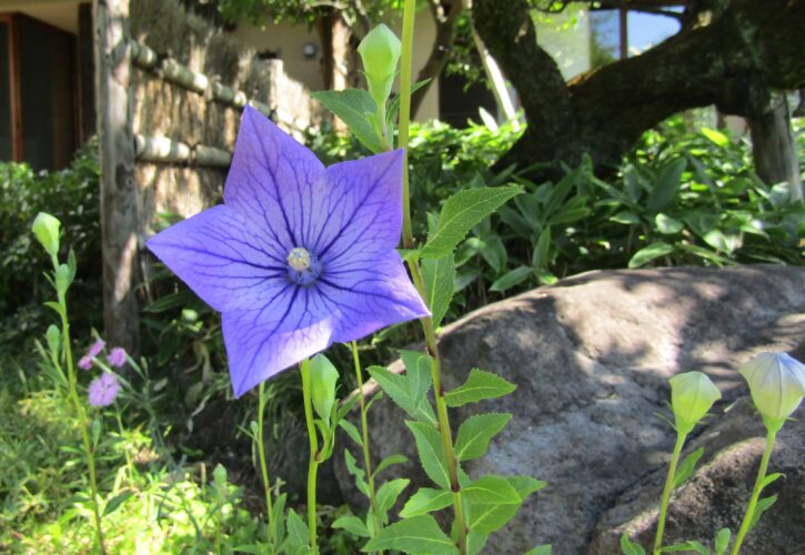 庭園のお茶室う前にキキョウが咲き始めました、花とつぼみの両方ががご覧いただけます。
