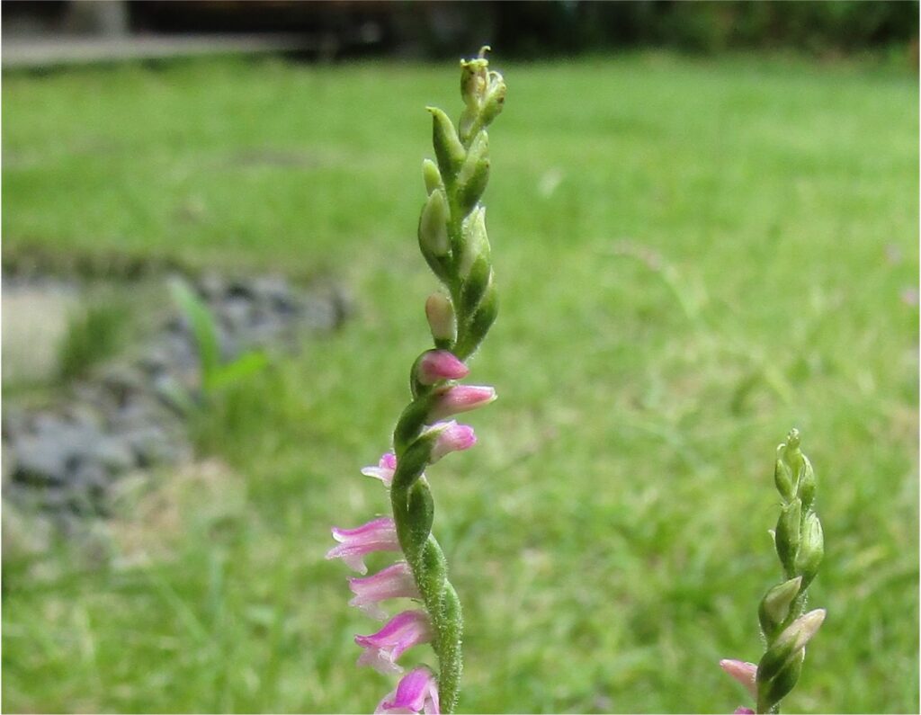 庭園の芝庭にネジバナの小さいピンクの花が咲いています、ぜひ見つけに来てください。