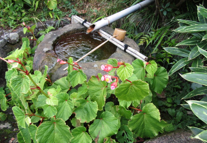 庭園の茶室前にある蹲(つくばい)の中にシュウカイドウが咲きました。